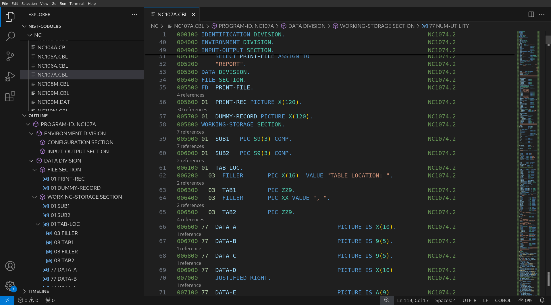 The extension shows inline reference information above definitons of data items and elements of the procedure division.